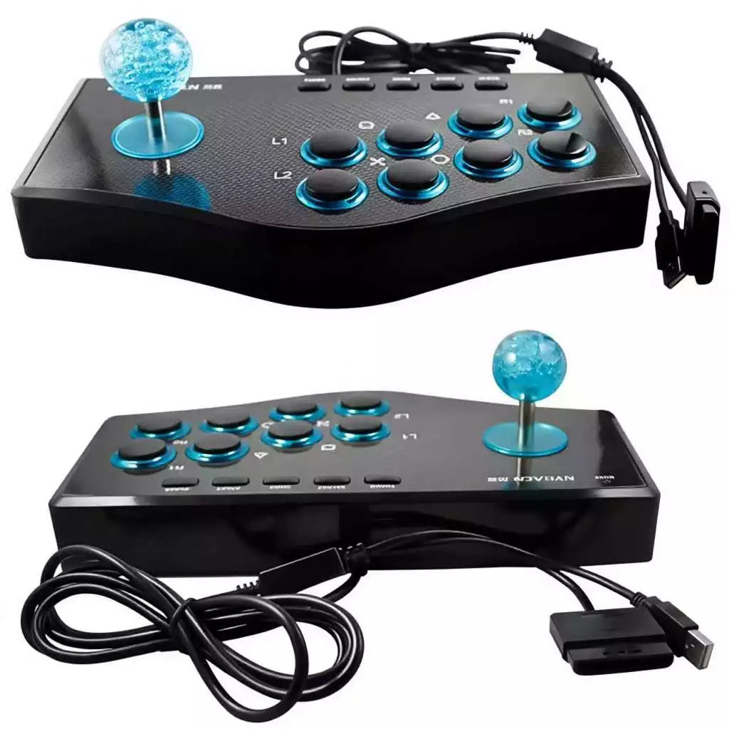 Possui 12 botões de ação, incluindo direcionais e gatilhos (L1, L2, R1, R2), além de botões de função como Select, Start e Mode.